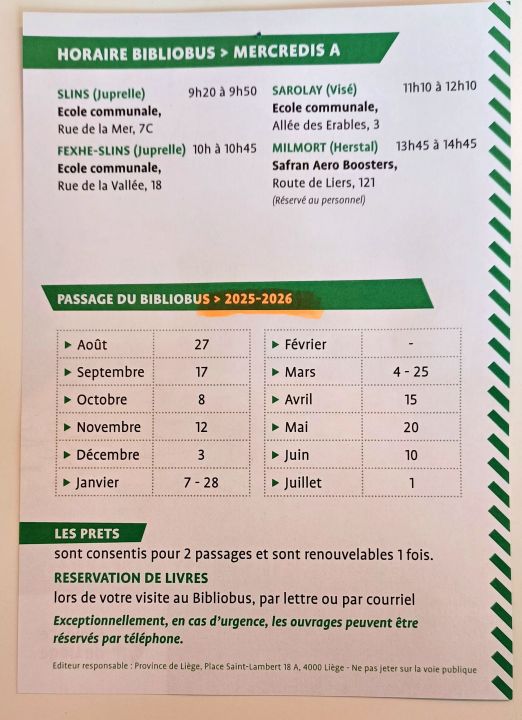 Ci-joint, vous trouverez l'horaire du Bibliobus afin de prévoir le retour des livres de votre enfant.
